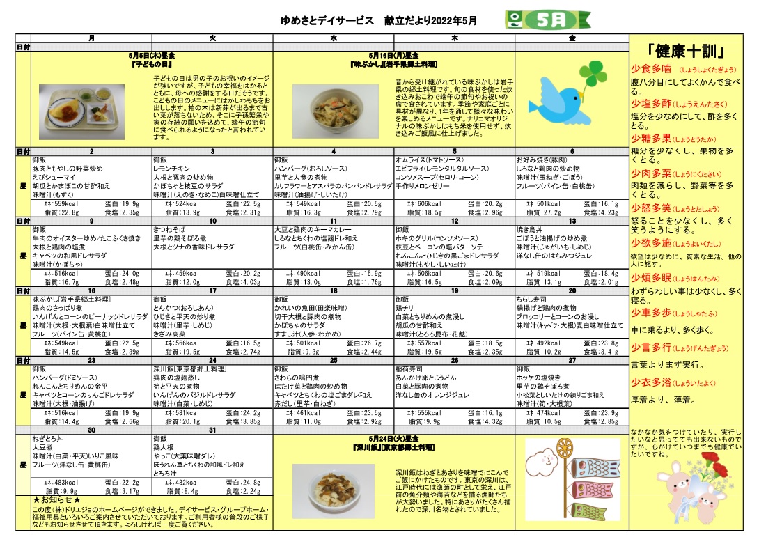 ゆめさとデイサービス 5月ご献立のお知らせ!